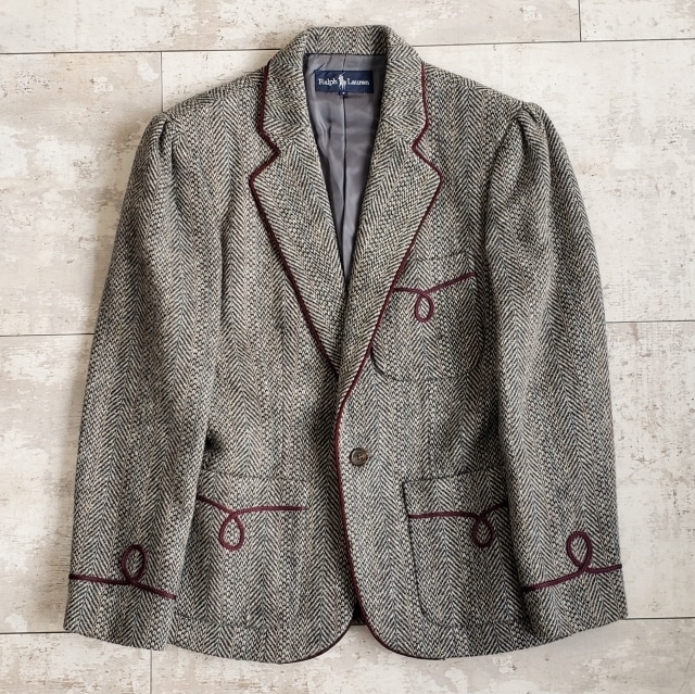 ・ヘリンボーンデザインのツイード生地にボルドーカラーの襟フチどりととポケット・袖口のヒモ(コード)が素敵なジャケットです。 ヴィンテージがお好きな方にもオススメです。 ・ブランド Ralph Lauren ・素材 ウール100% 裏地:キュプラ100% ・カラー グレー系(画像参照) ・付属品 無し ・サイズ 7 ※Sサイズ程度 実寸をご参照ください 着丈 約59.0cm(襟の付け根から裾までの寸法) 身幅 約44.0cm (胸囲・脇下間の寸法) 肩幅 約39.5cm 袖丈 約56.0cm ・商品コンディション 裏地右脇に輪シミがあります。(画像参照) 裏地に軽くピリングしている箇所があります。(画像参照) その他軽い使用感がありますが、大きなダメージがなくまだまだご愛用いただけるコンディションです。(画像参照) ヴィンテージ商品ですが、経年による状態変化がなく、年数経過有る商品の中でも良いレベルのコンディションです。ヴィンテージ商品にご理解のある方のご購入お願いいたします。 ---------------------------------------------------------------- ☆配送・日時指定について☆ ※当方都合上、日曜日・祝日・年末年始の「配送手配」「ご質問、取引メッセージの返答」等が出来ません。 ※東京都からの発送になります。日時指定は関東近郊はご購入日の翌々日から、四国地方・中国地方・九州地方・青森県・北海道は3日後、沖縄県は4日後からの指定でお願いいたします。 ※配送は佐川急便にて行いますが、離島・沖縄県はゆうパックにての配送手配になります。 ↓詳細はこちら https://seri.base.shop/blog/2020/08/25/102938 ご了承お願いいたします。