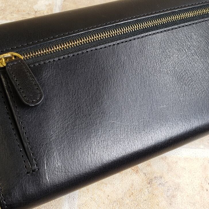 未使用品ですが、保管時にできた外装レザーやファスナーポケット室内に線状の薄いスレ、軽いスレが多数あります。(画像参照)