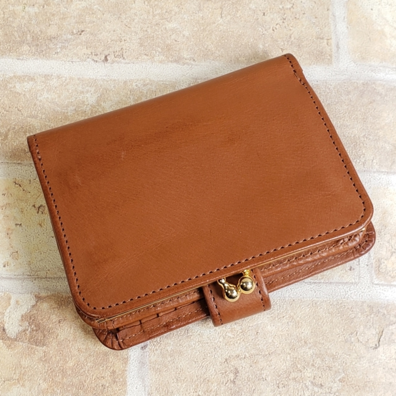 未使用品ですが、保管時にできた軽いスレ、軽いアタリがレザー所々にあります。がま口金具に細かな変色があります。札室上部にのりのはみ出し跡あります。(画像参照)