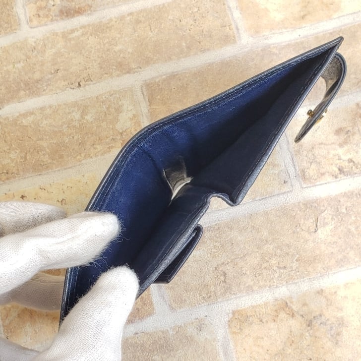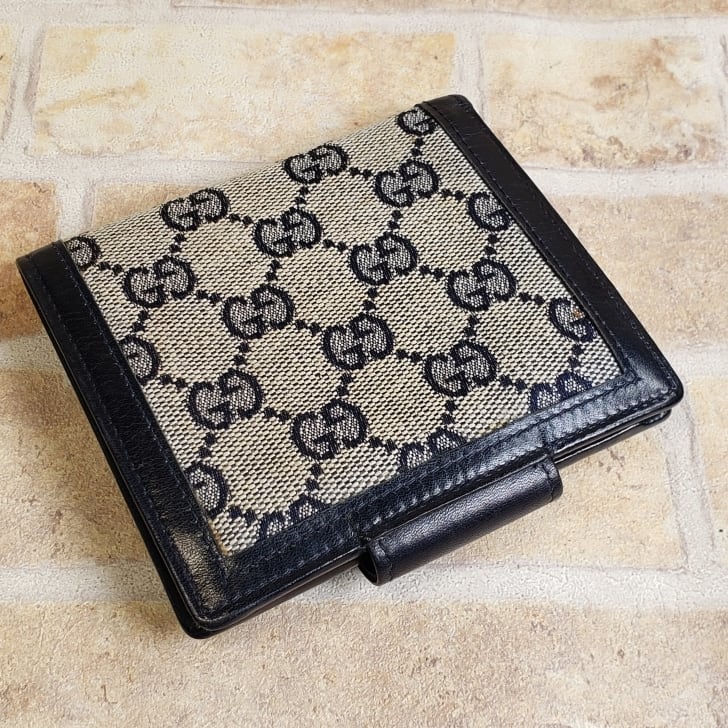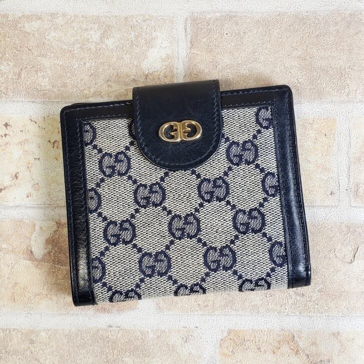 ・ダークネイビーとグレー系のGG柄キャンバスと、ダークネイビーのレザーの組み合わせが素敵な折財布です。
