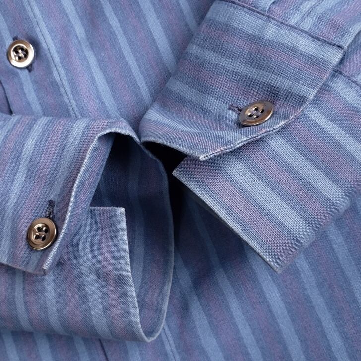 ブルー系に暖色が混ざった ストライプ 長袖 シャツです。