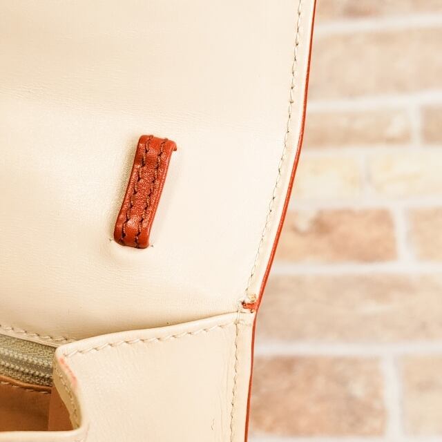 フラップ裏両側本体との付け根部分にアイボリーカラーのレザー部分に切れがあります。(画像参照)