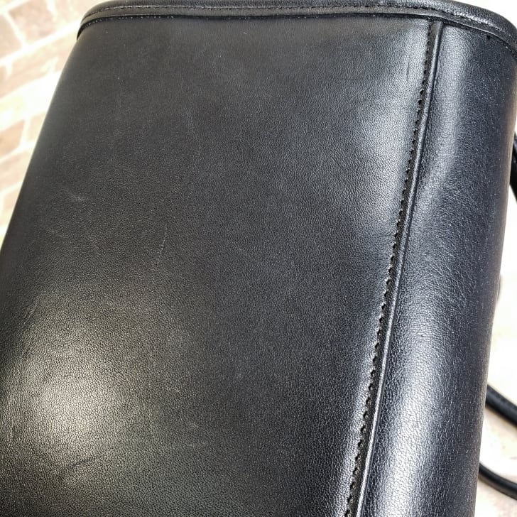 外装レザー全体に薄い線状のスレ、軽いスレ、スレによる軽い退色が所々にあります。(画像参照)