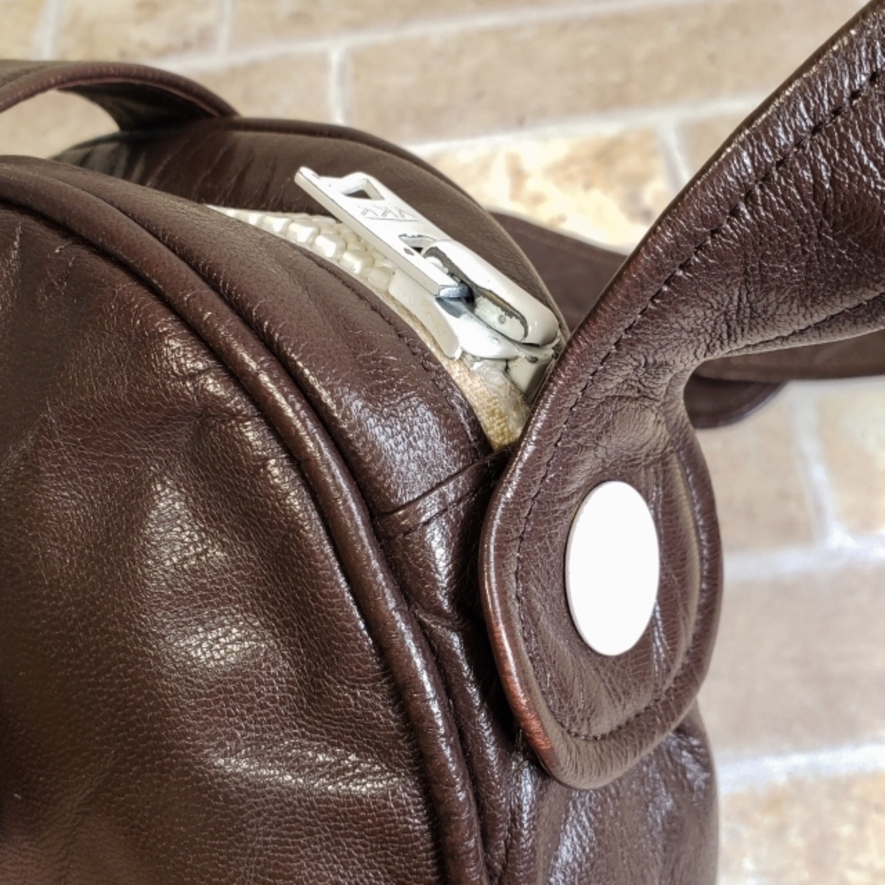 間口ファスナー引手にメッキ剥がれ、スレ、ファスナーのファブリック部分に薄いスレ汚れがあります。(画像参照)