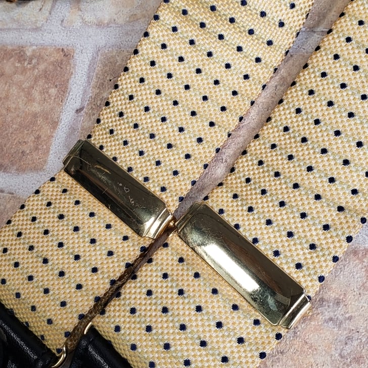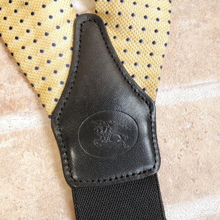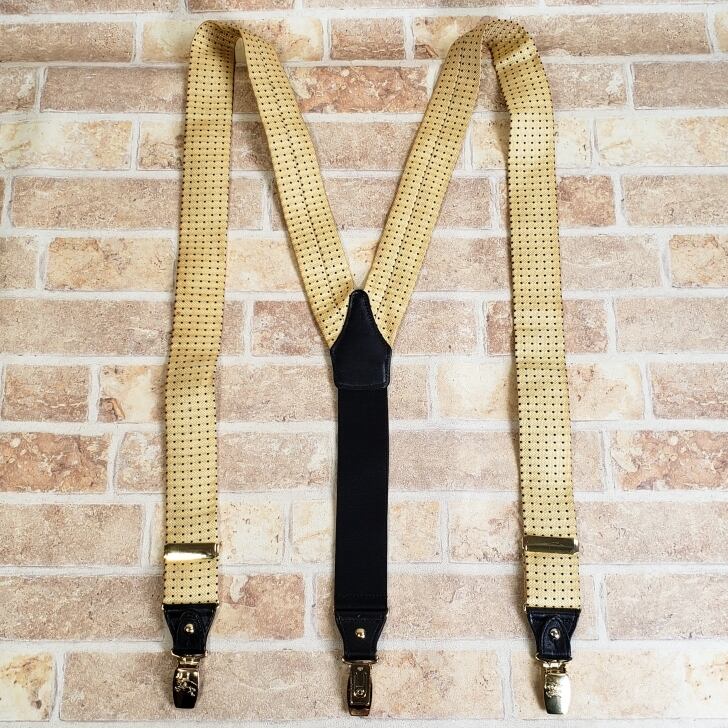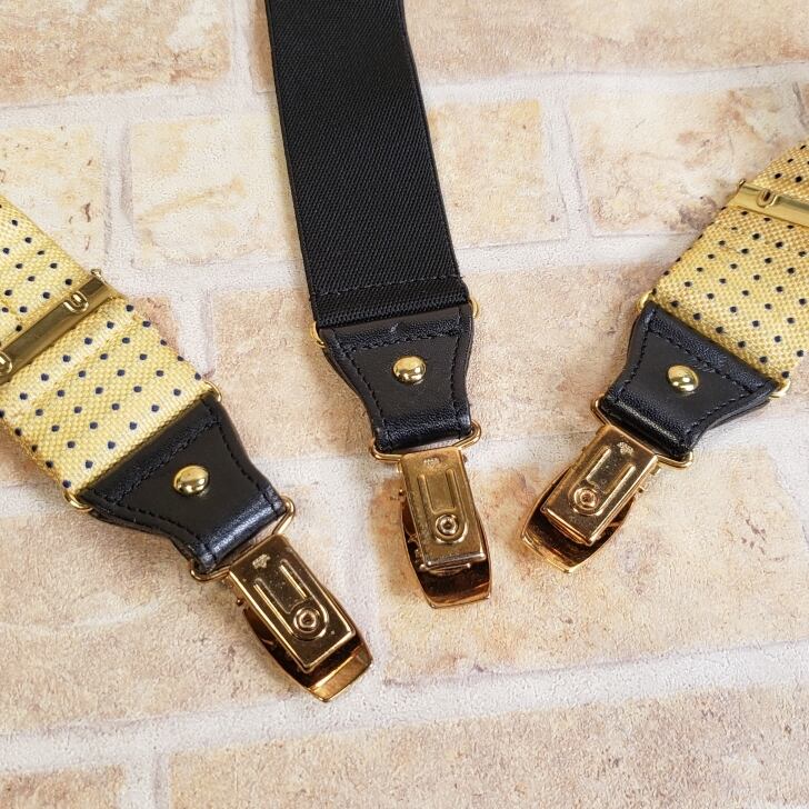 ・イエロー系ファブリックにネイビーのドットがデザインされた Y型 クリップ式 サスペンダーです。