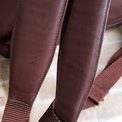 外装レザーのフロント右下辺りに線状のスレキズ、全体所々に軽い線状のスレ、軽いスレ、スレによる軽い退色があります。(画像参照)