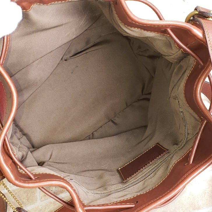 外装ブラウンレザー底フチやフチ近く、上部フチや巾着紐に軽いスレキズ、スレ、スレによる退色があります。ショルダーベルトの中央辺りに細い線状のスレキズが1か所あります。(画像参照)