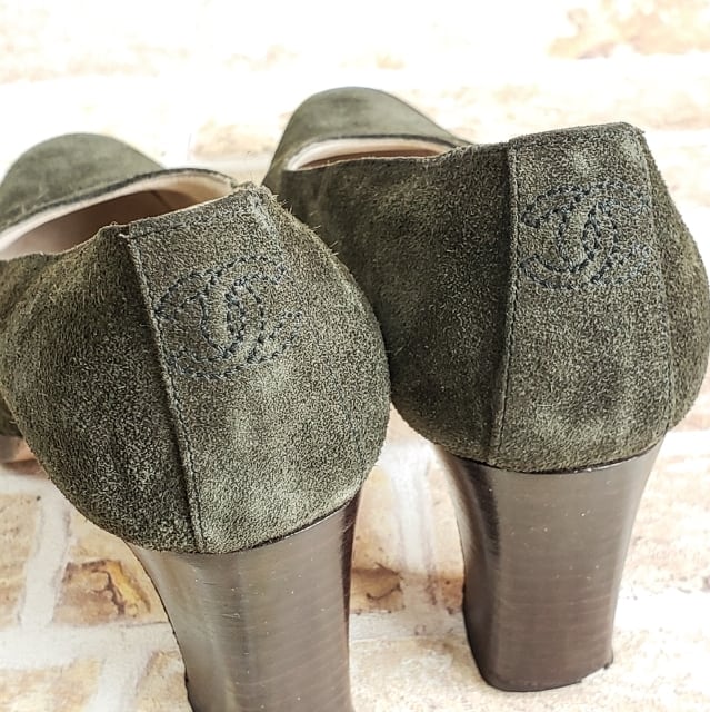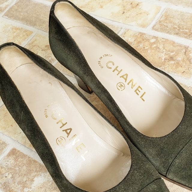 シャネル CHANEL ☆ ヴィンテージ スエードレザー パンプス 35 イタリア製 モスグリーン ココマーク刺繍