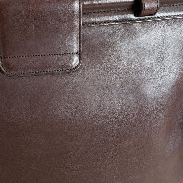 外装レザー全体に線状のスレ、スレによる退色があります。特にフチに退色があります。(画像参照)