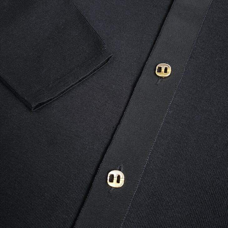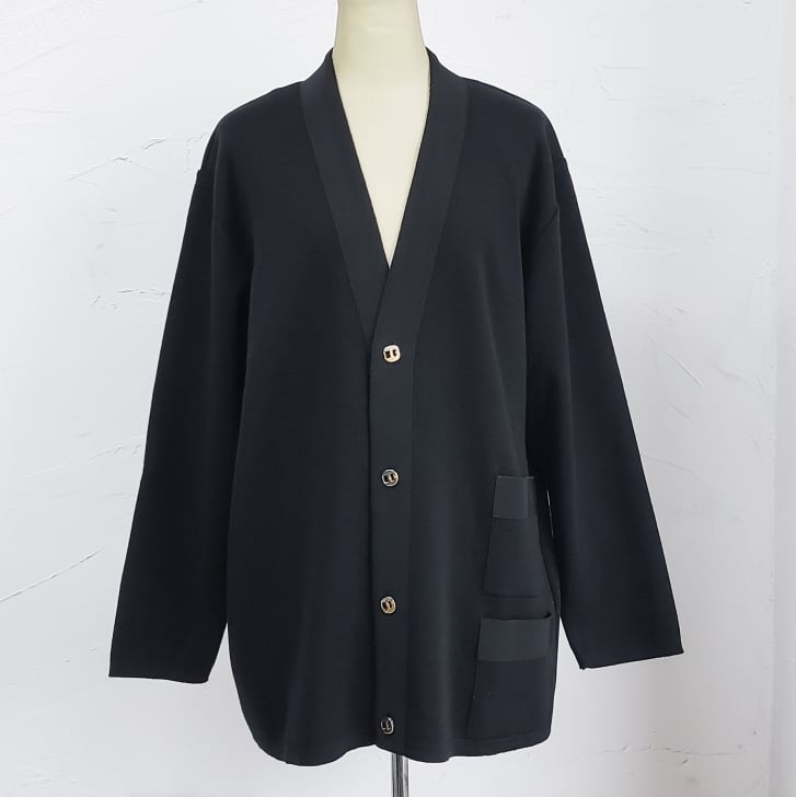 ・シルバーとゴールドカラーの配色が素敵なボタンがついた ウール カーディガンです。