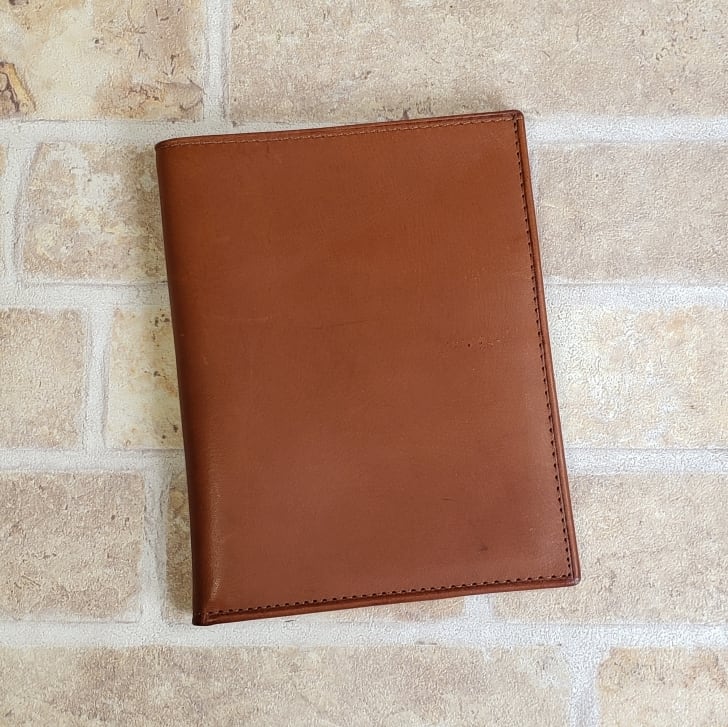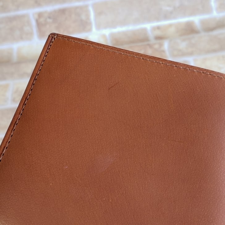 B7程度のサイズ感でノート等を差し込んでいただけます。上部にはお札をいれられるポケットもあるので札入れ/お財布のようにもつかっていだけます。