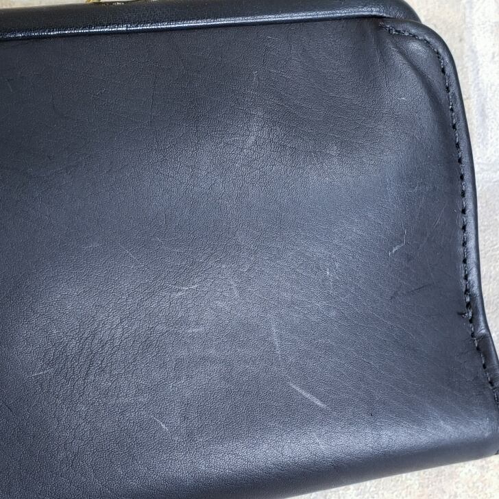 未使用品ですが、保管時にできた軽いスレ、薄い圧迫痕、がま口つまみの軽い変色・くすみがあります。(画像参照)