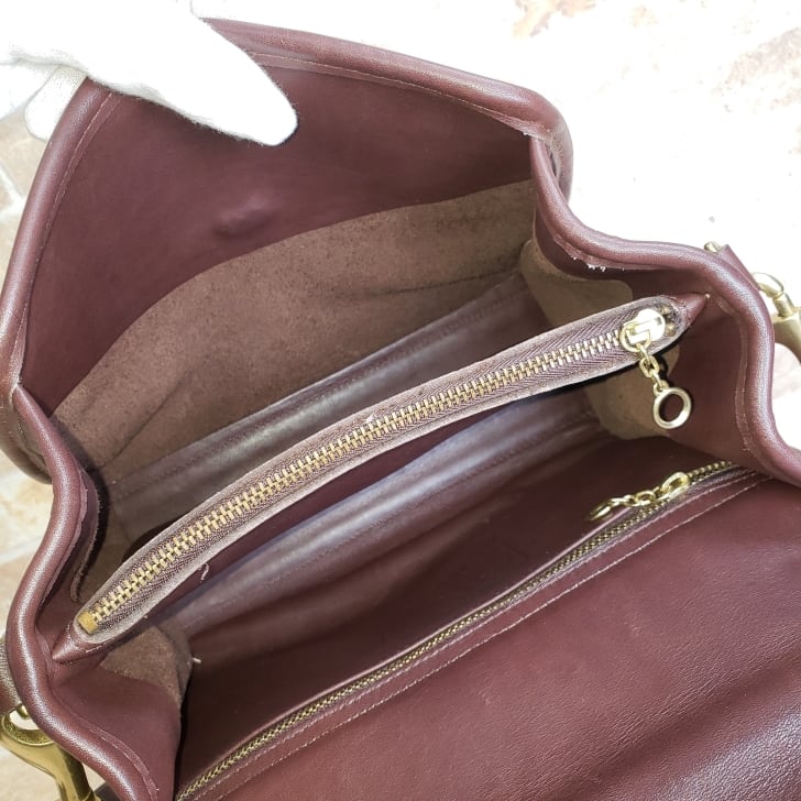 ・人気のターンロックデザインのビンテージ/ヴィンテージのコーチ、オールドコーチの2WAYショルダーバッグです。中は仕切で2室にわけられており、適度な大きさがあります。自立します。