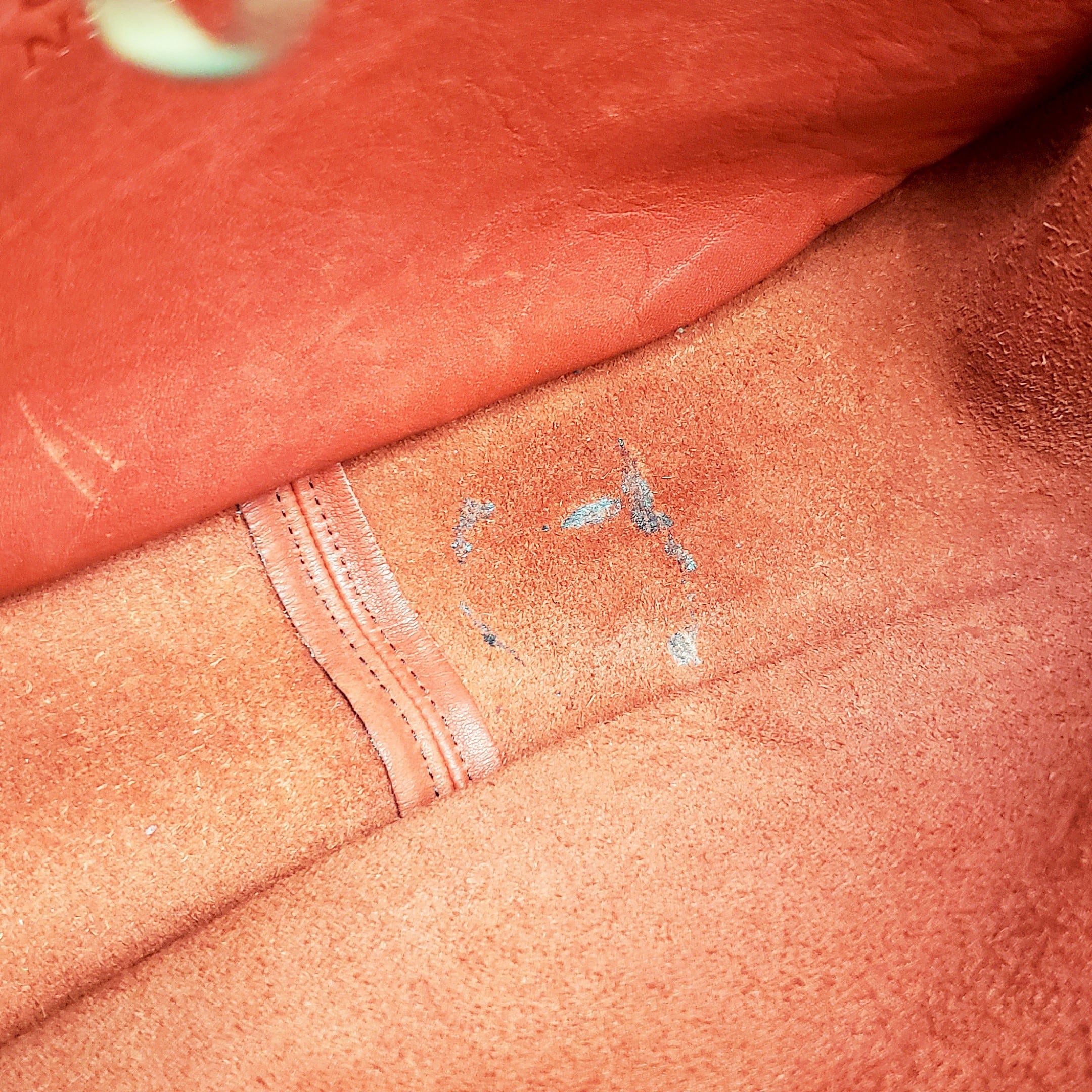 フロントフラップ部分中央ベロ部分上部に軽い汚れがあります。全体的にレザーの軽いスレ・レザーのフチ部分全体に軽いスレがあります。内地底面にアメのような物が貼りついた跡があります。(ベタベタはしていません)
