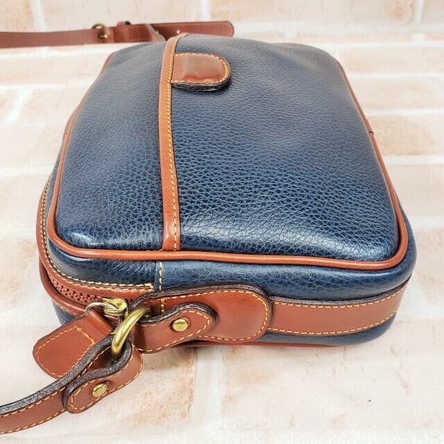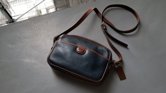 ・ネイビーのシュリンクレザーと、ブラウンのパイピング・ショルダーの組み合わせが素敵なバイカラーデザイン!ビンテージ/ヴィンテージのコーチ、オールドコーチの斜め掛けOK ショルダーバッグです。