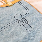・デニム気にフラップとベルトのだまし絵ステッチデザインがポイントのハンドバッグです。