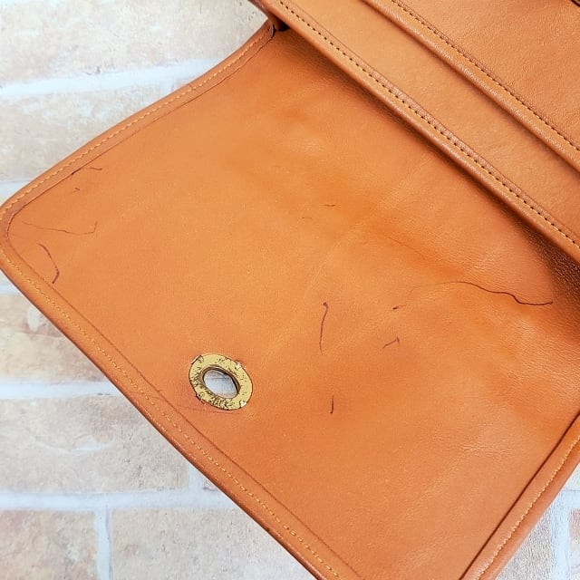 特に外装側面パイピングレザーコーナー付近、フラップ上部・底面にスレによる色ムラが多くあります。(画像参照)