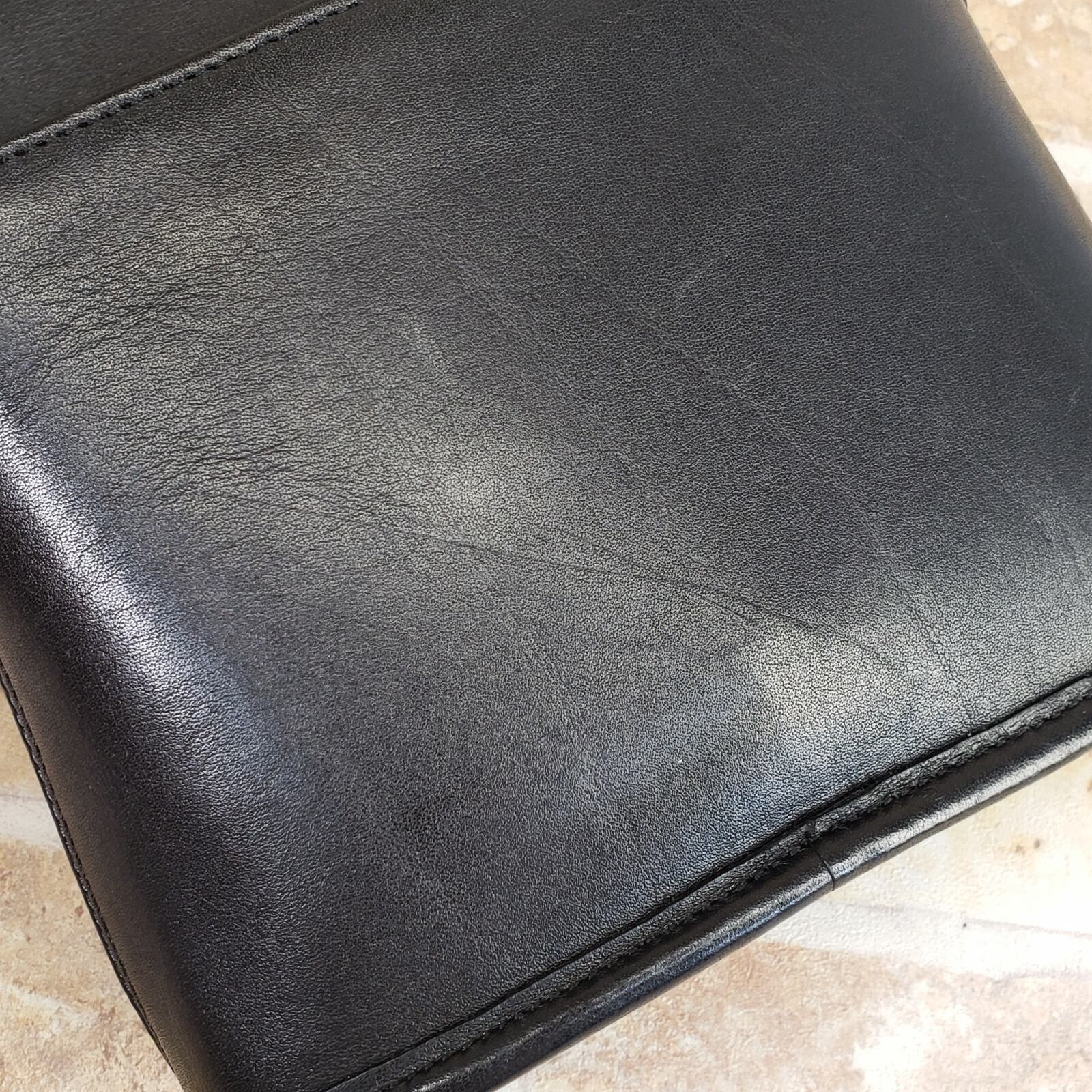 外装背面に爪で引っ掻いたような線状の薄いスレ、レザー全体に軽いスレ、コーナー部分にスレがあります。(画像参照)