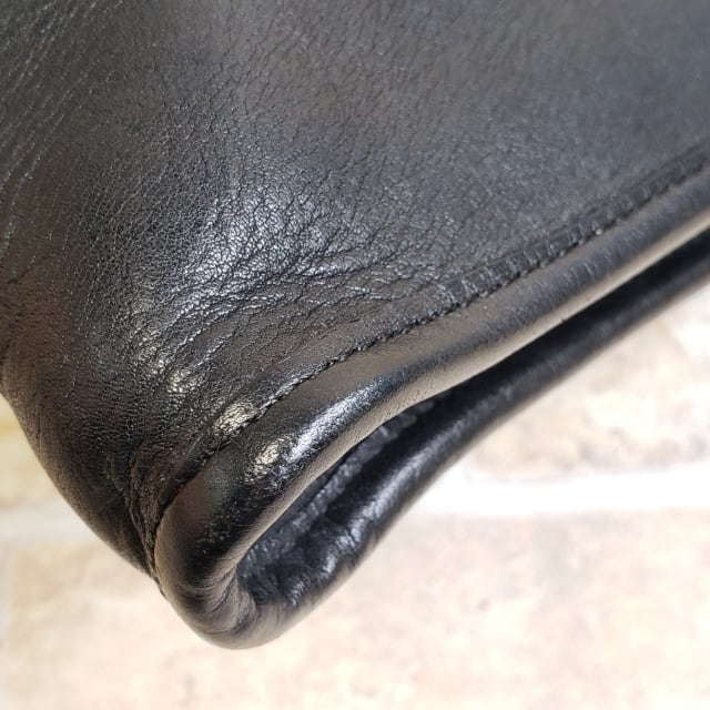 外装レザー全体にスレ・スレによる退色、爪でひっかいたような線状の薄いスレ、本体やハンドル・がま口のフチにスレによるアタリがあります。(画像参照)