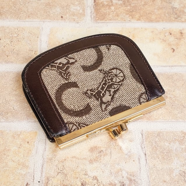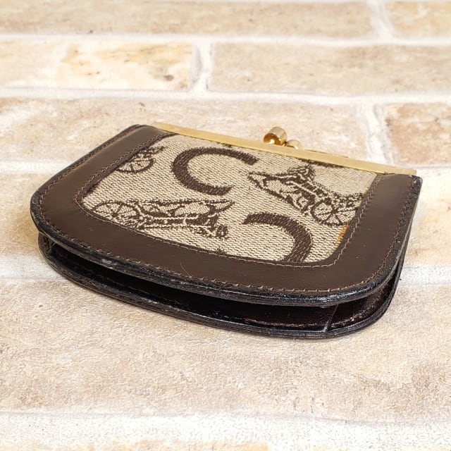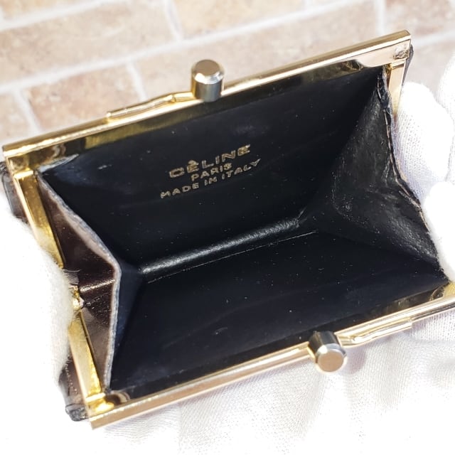セリーヌ CELINE ☆ ヴィンテージ レザーコンビ がま口 小銭入れ コインケース イタリア製 ダークブラウン 馬車柄