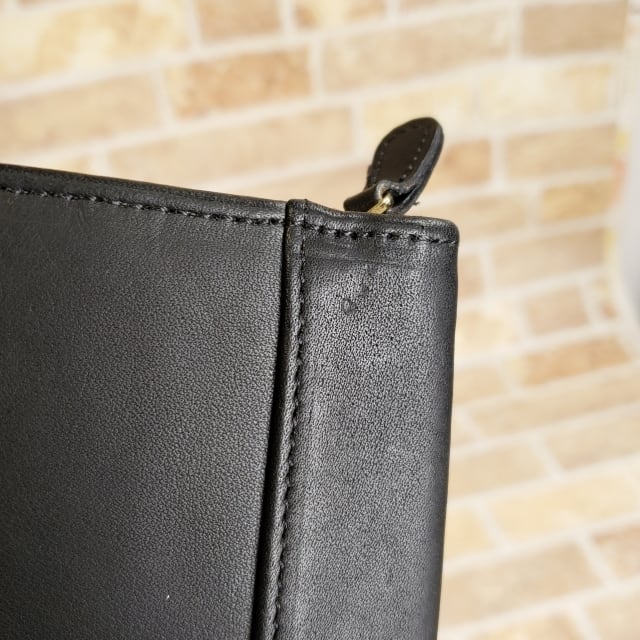外装フロントの右上コーナー辺りにレザータグのボールチェーンがあたってできた点状の圧迫痕があります。(画像参照)