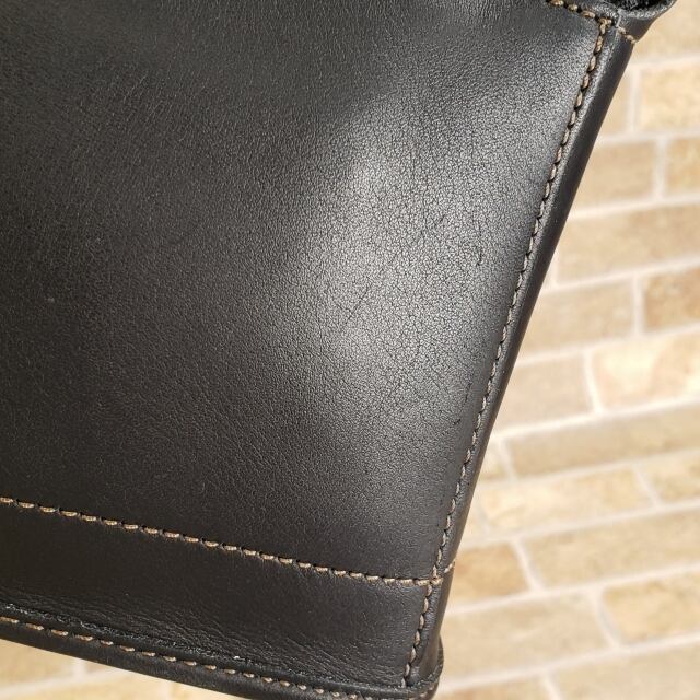 未使用品ですが、保管時にできた軽い線状のスレが外装レザーの所々にあります。